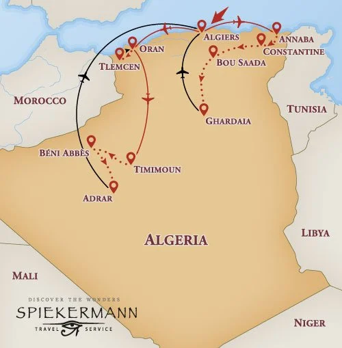Algeria is a vast country of breathtaking scenery, well-preserved Roman ruins, pre-historic cave paintings, impressive museums, and a strong Berber culture. This journey will take us from the sweeping shores of the Mediterranean to the majestic green mountains, through the vast Sahara Desert, and into the palm-fringed oases. Explore the Roman ruins of Timgad, the former Roman port of Caesarea, the oasis town of Bou Saada, the Kasbah of Algiers, and the unique fortified town of Ghardaia and its Mozabite villages. No tour of Algeria would be complete without a visit to the dramatic city of Constantine, the “city of gorges and bridges.” From here, the tour travels to the western region of Algeria to the tranquil Mediterranean city of Oran and on to Tlemcen, a beautiful town with a rich diverse culture and lush vineyards and olive plantations. The trip ends on a high note in the heart of the Algerian Desert to explore the oases, ksours (fortified villages), ancient and holy cities, massive sand dunes, and much more in and around Timimoun, the “Red Oasis,” the oasis town of Béni Abbès home to seven castles, and the ancient desert city of Adrar.